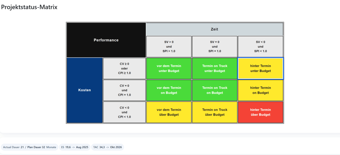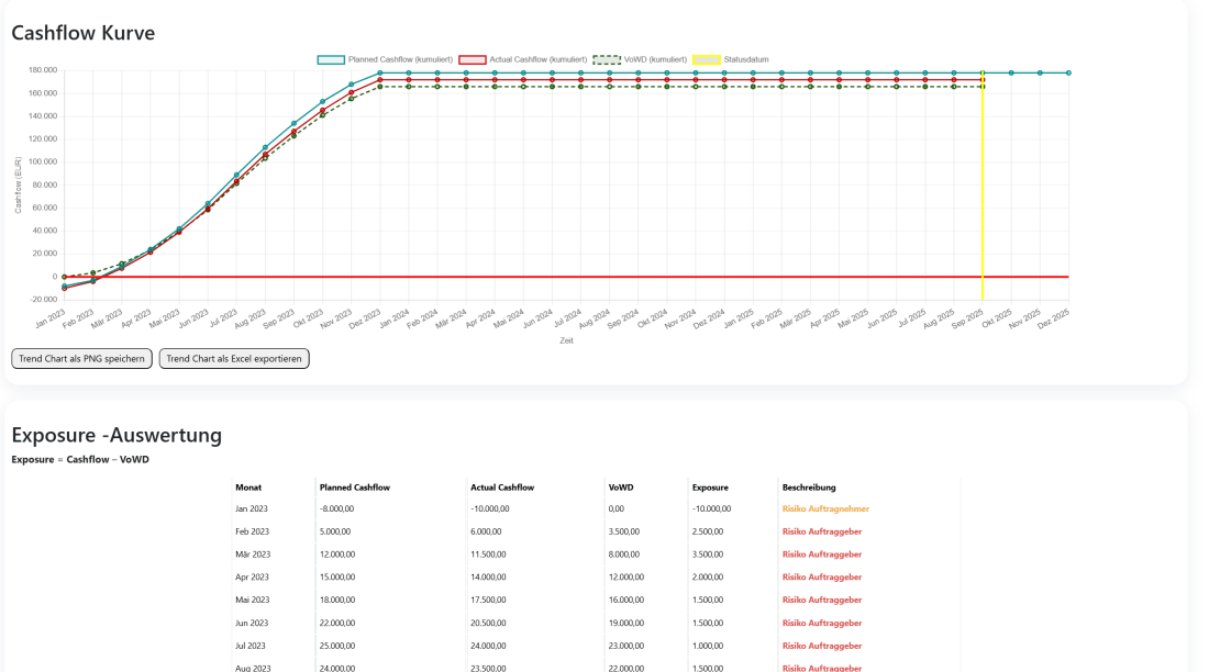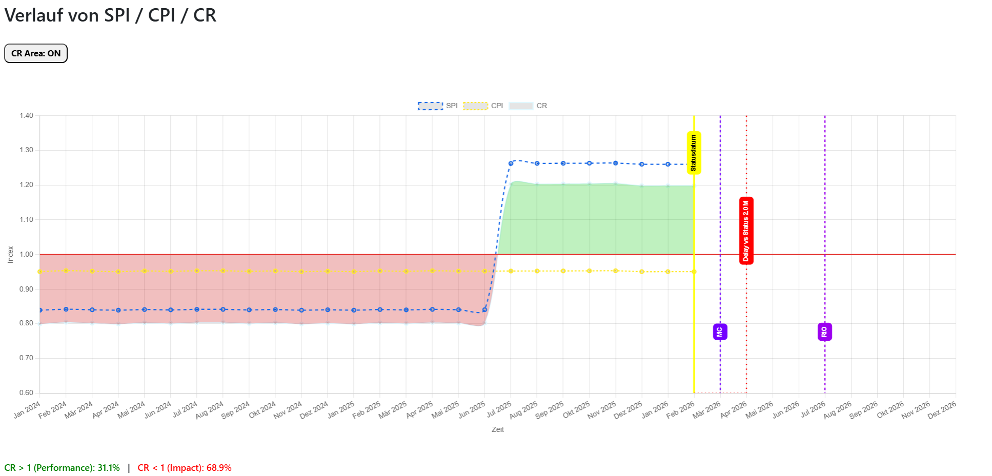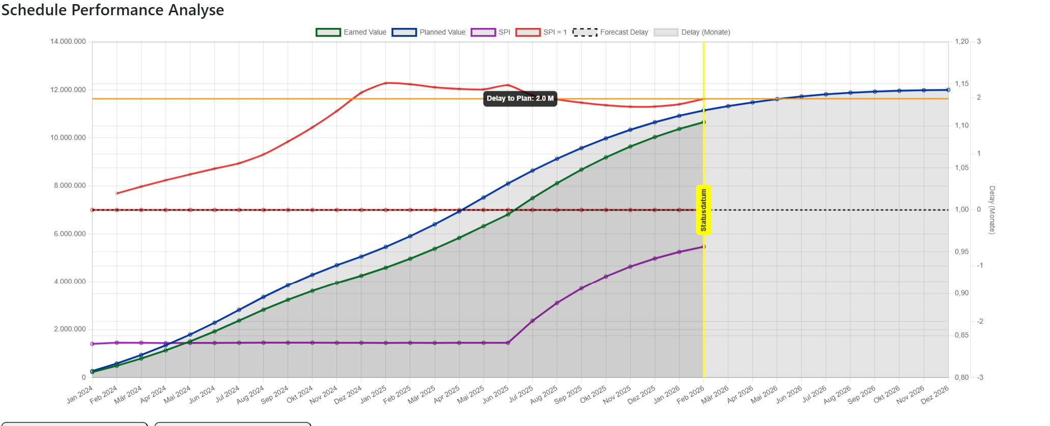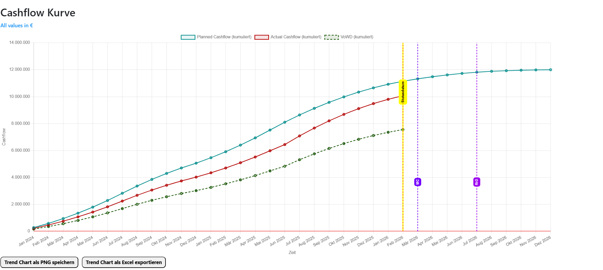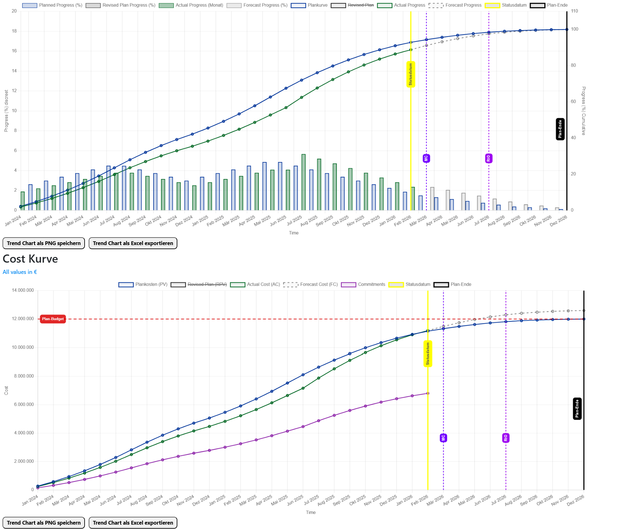 Beide Kurven sind dynamisch, interaktiv und klar strukturiert, wodurch Sie jederzeit einen präzisen Überblick über den aktuellen Projektstatus und zukünftige Trends erhältst – eine unverzichtbare Grundlage für fundierte Projektentscheidungen.