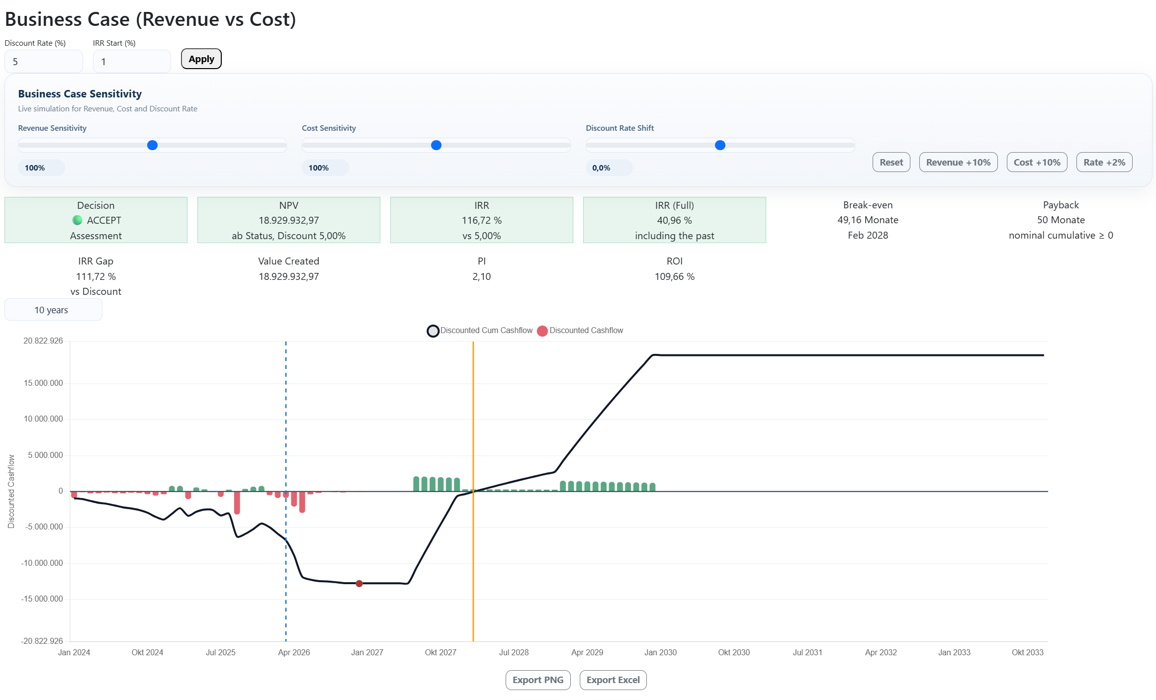 Dynamische Wirtschaftlichkeitsanalyse mit Berechnung von NPV, IRR und Break-Even auf Basis projektspezifischer Annahmen.