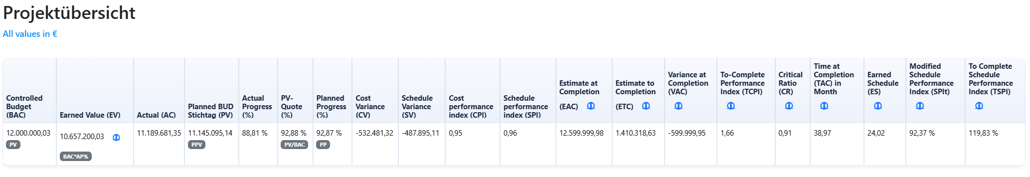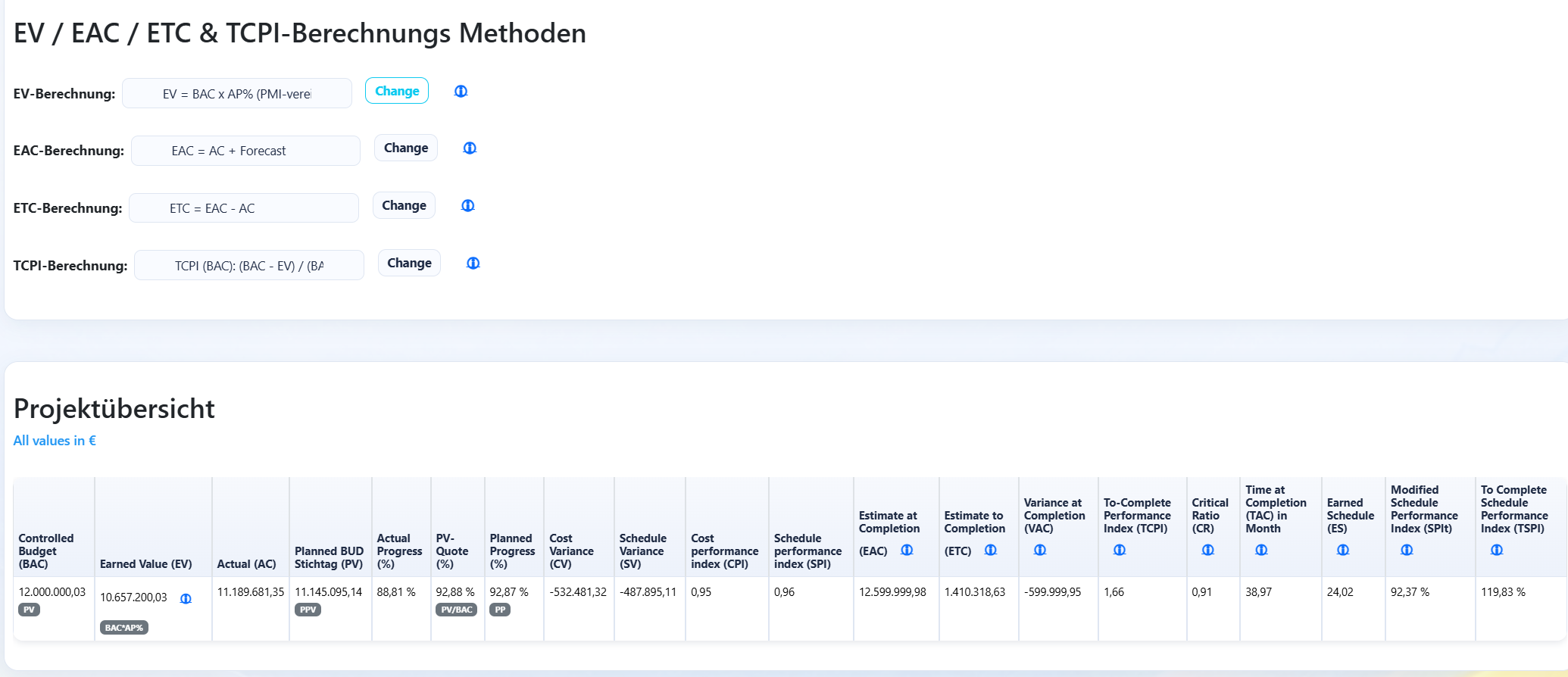 Zentrale Dateneingabe und übersichtliche Projektübersicht. Automatische Berechnung von CPI, SPI, VAC, TCPI, CR, TSPI und weiteren Kennzahlen.