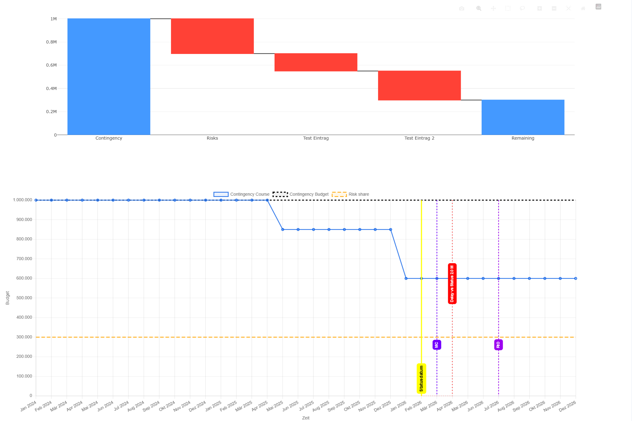 Zusätzlich ermöglicht die Darstellung frei definierbarer Marker mit individuellem Text und Datum zur Kennzeichnung projektspezifischer Ereignisse oder Meilensteine. Ergänzend wird eine P50-Risikokurve integriert, welche auf probabilistischen Simulationen basiert und eine realistische Erwartung der Projektentwicklung unter Berücksichtigung von Unsicherheiten abbildet.