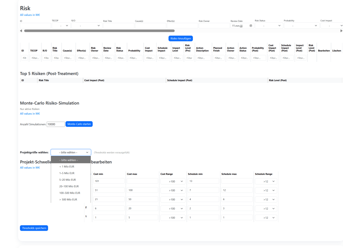 Zentrale Risikoerfassung mit Heatmap, Simulationen und integrierter Prognose (EAC, TCPI). Risiken werden quantitativ und visuell steuerbar.